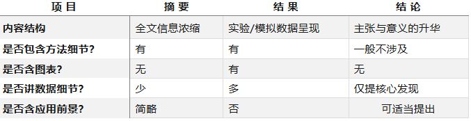 摘要是全景鸟瞰,结果是数据实录,结论是观点收束。