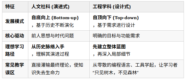 设计式知识(如计算机、工程等学科):这类知识是“自顶向下”构建的。它们通常源于一个明确的需求(例如“我需要一个能快速计算的工具”),然后通过逻辑拆解、模块设计、最终实现。计算机的诞生不是自然演进的结果,而是一个目标明确的工程设计。