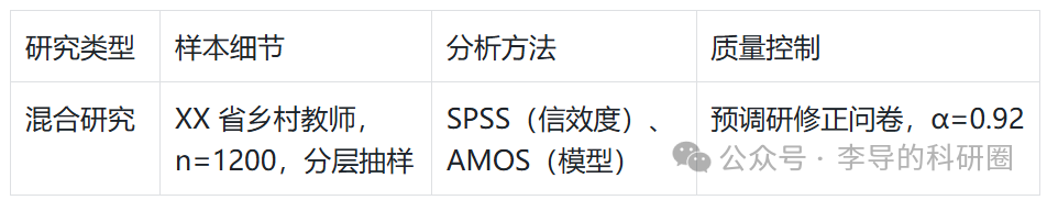① 样本选择:“样本来源(XX 省高校教师)、样本量(n=1200)、抽样方法(分层随机抽样)”—— 判断样本是否有代表性,自己选样本时可参考;