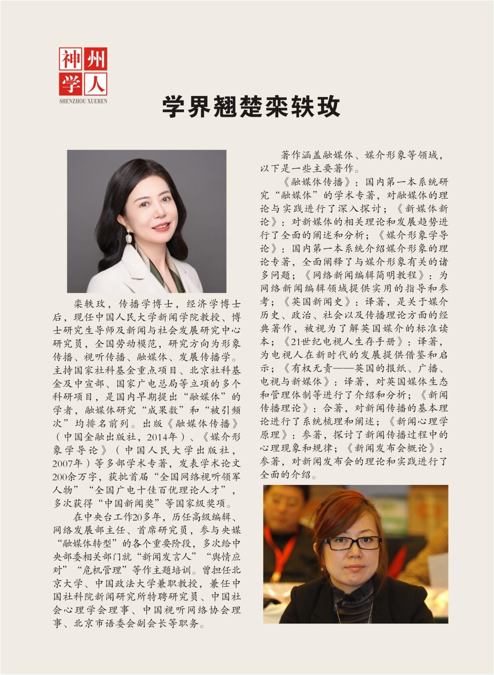 栾轶玫,传播学博士,经济学博士后,现任中国人民大学新闻学院教授、博士研究生导师及新闻与社会发展研究中心研究员,全国劳动模范,研究方向为形象传播、视听传播、融媒体、发展传播学。主持国家社科基金重点项目、北京社科基金及中宣部、国家广电总局等立项的多个科研项目,是国内早期提出“融媒体”的学者,融媒体研究“成果数”和“被引频次”均排名前列。出版《融媒体传播》(中国金融出版社,2014年)、《媒介形象学导论》(中国人民大学出版社,2007年)等多部学术专著,发表学术论文200余万字,获批首届“全国网络视听领军人物”“全国广电十佳百优理论人才”,多次获得“中国新闻奖”等国家级奖项。