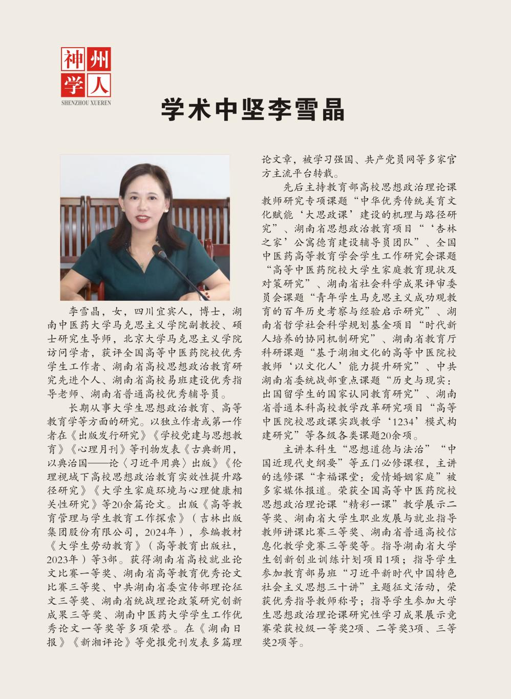 李雪晶,女,四川宜宾人,博士,湖南中医药大学马克思主义学院副教授、硕士研究生导师,北京大学马克思主义学院访问学者,获评全国高等中医药院校优秀学生工作者、湖南省高校思想政治教育研究先进个人、湖南省高校易班建设优秀指导老师、湖南省普通高校优秀辅导员。
