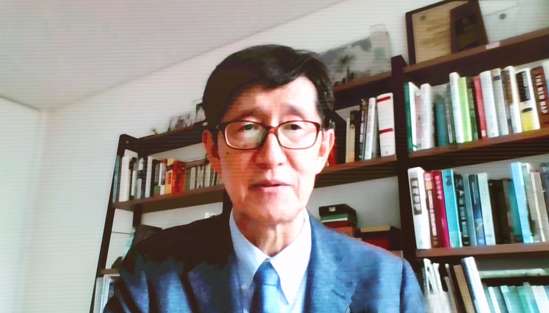 韩国拉美协会名誉主席金元镐作视频致辞。记者 朱高磊/摄