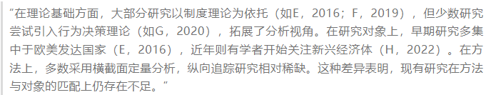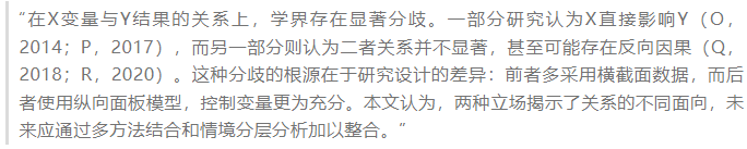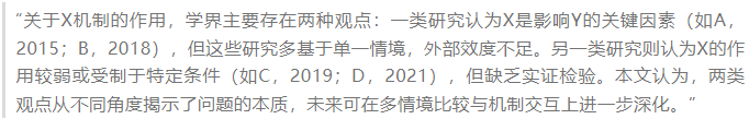 反对型:指出已有研究的局限与偏差,提出质疑或新的解释路径。例如,“尽管A学者认为Z变量无显著影响,但其样本规模有限,结论的普适性仍有待检验”。