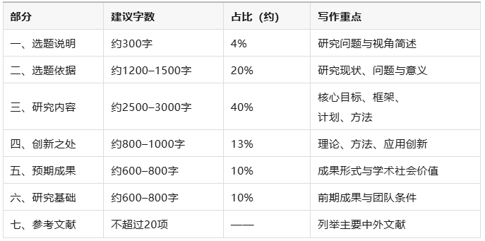 课题申报书是科研项目立项的重要依据,其结构设计与内容表达直接影响评审专家对研究价值与可行性的判断。撰写时应突出目标导向、问题意识和学科视角,保持逻辑清晰、主题突出、层次分明、内容翔实、排版规范的特点。以下对各部分布局与撰写重点进行说明。比如以常见社科规划课题的的论证部分字数不超过7000字为例。