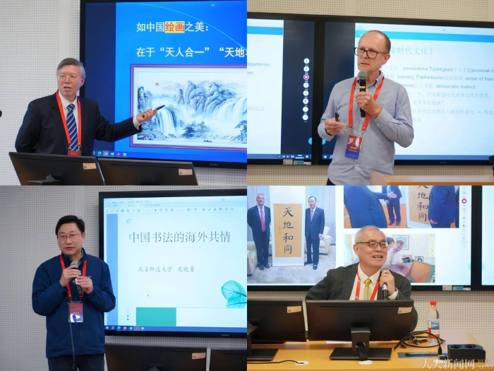 分论坛下半场,中共中央编译局原秘书长杨金海,澳大利亚马克思主义哲学家、中国人民大学哲学院教授薄国强,北京师范大学教授、艺术与传媒学院书法系主任虞晓勇,中国人民大学中国书法与传统文化融合创新主任、上海交通大学二级教授、联合国NGO“书法小联合国”主席周斌分别围绕“中国文化的中和精神构建人类文明新形态”“文化的历史逻辑:‘野蛮时代’高级阶段的贡献”“中国书法的海外共情”“和合文化与笔墨共情”作主题发言。中国人民大学美育中心主任费佳主持。