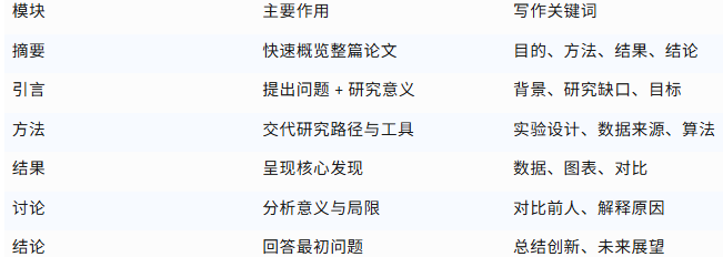 就像一场旅程:引言告诉读者你要去哪里;方法解释你怎么走;结果展示你走到了哪里;讨论说明这趟旅程有什么意义。