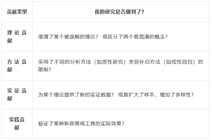 “研究贡献” (Research Contribution),听起来很“高大上”,但文章给的定义很实在:因为你这篇文章的存在,对现有的理论或实践带来了什么启发、促进或改善。换句话说,它就是你论文价值的集中体现。我们之所以要写,是因为我们发现了现有研究还没做、或没做好的事。去弥补那个“文献缺口” (literature gap),就是最大的贡献。