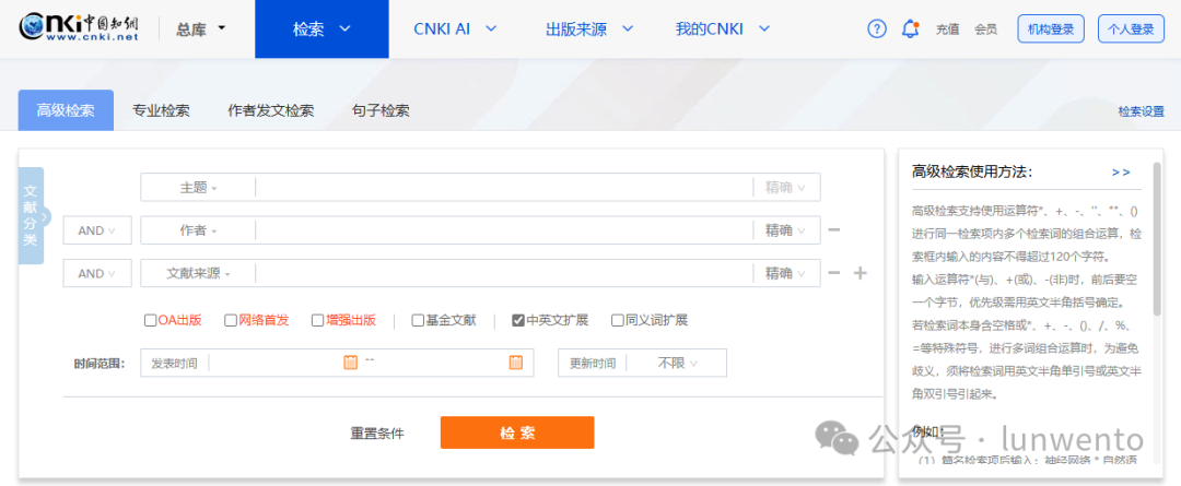 相较普通搜索,高级检索可通过多项组合条件实现定向、精准检索。