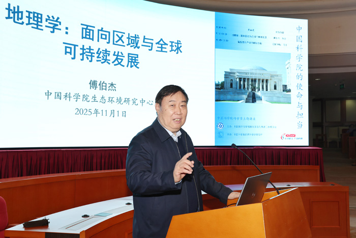 傅伯杰以《地理学:面向区域与可持续发展》为题作报告,阐释地理学破解人地关系难题的核心价值。他剖析了可持续发展挑战,结合自身实践介绍地理学对国家决策的支撑作用,其领衔提出的“自然关系指数(NRI)”框架,印证了基础研究服务高质量发展的路径。