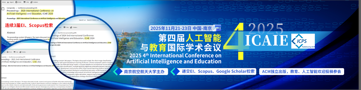 第四届人工智能与教育国际学术会议(ICAIE 2025)由南京航空航天大学主办,南京航空航天大学人工智能学院、AEIC学术交流中心承办,集美大学诚毅学院信息工程系、厦门工学院、嘉兴大学商学院、武汉学院协办,将在2025年11月21日至23日于南京举办。本次会议旨在汇聚来自全球的学者、教育工作者、研究人员和行业专家,共同探讨人工智能在教育领域中的创新应用与发展前景。