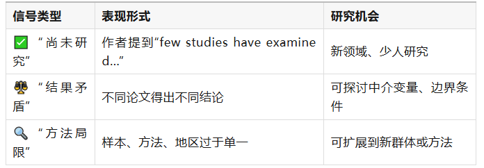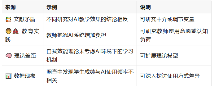 例:文献多聚焦AI在大学理工科教学中的应用,但对人文学科学生的学习动机影响研究很少。