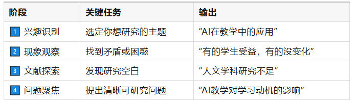 例:你对“人工智能辅助教学”感兴趣 → 这是一个主题,还不是问题。