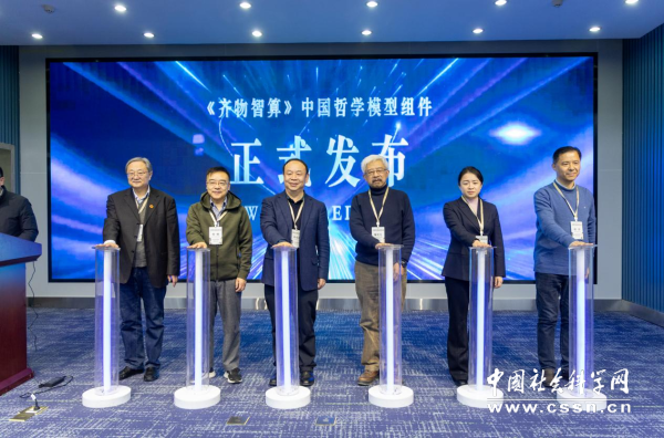 随后,会议举行了“齐物智算”中国哲学模型组件发布仪式,沙勇忠、鞠实儿与甘肃省委宣传部理论教育处处长王妍蓉、中国人民大学哲学院吴玉章讲席教授曹峰、《江海学刊》杂志社社长赵涛及甘肃省人大常委会教科文卫工作委员会原主任范鹏共同发布。