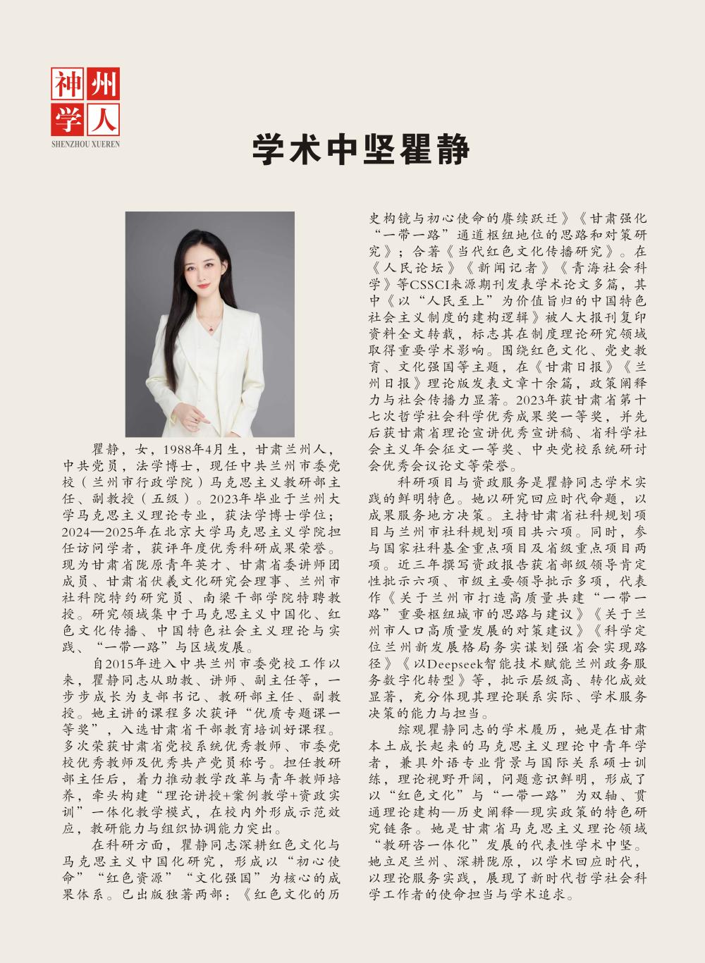 综观瞿静同志的学术履历,她是在甘肃本土成长起来的马克思主义理论中青年学者,兼具外语专业背景与国际关系硕士训练,理论视野开阔,问题意识鲜明,形成了以“红色文化”与“一带一路”为双轴、贯通理论建构—历史阐释—现实政策的特色研究链条。她是甘肃省马克思主义理论领域“教研咨一体化”发展的代表性学术中坚。她立足兰州、深耕陇原,以学术回应时代,以理论服务实践,展现了新时代哲学社会科学工作者的使命担当与学术追求。