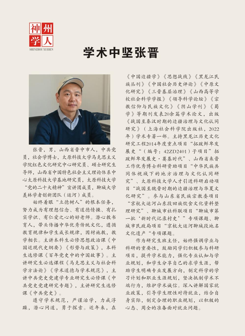 张晋,男,山西省晋中市人,中共党员,社会学博士,太原科技大学马克思主义学院红色文化研究中心研究员、硕士研究生导师,山西省中国特色社会主义理论体系中心太原科技大学基地研究员,太原科技大学“党的二十大精神”宣讲团成员,聊城大学羡林学者创新团队(运河)成员。