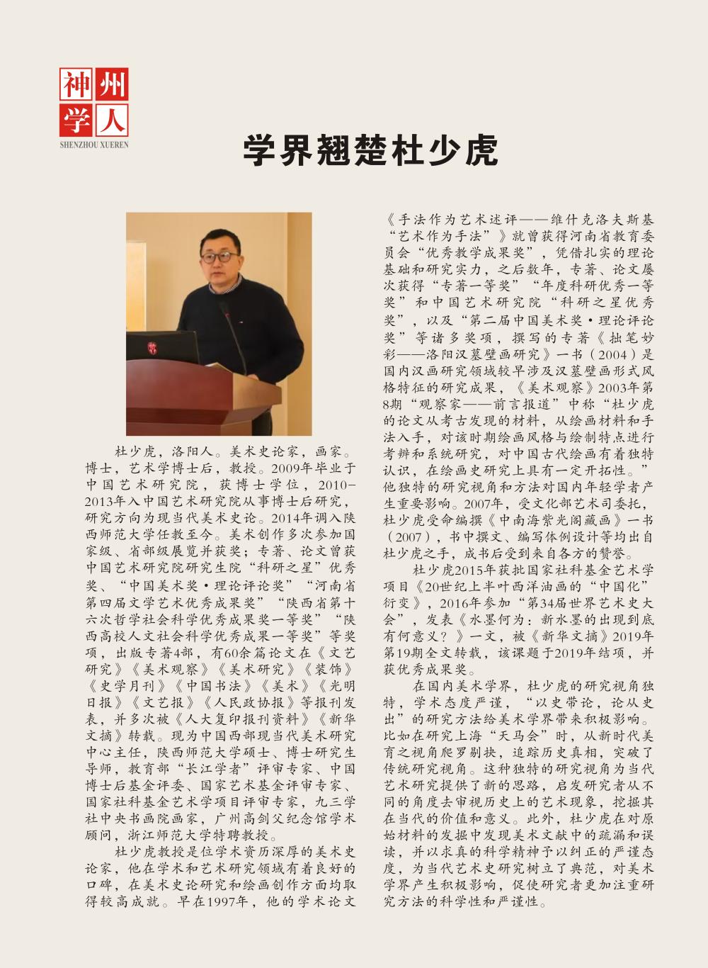 杜少虎教授是位学术资历深厚的美术史论家,他在学术和艺术研究领域有着良好的口碑,在美术史论研究和绘画创作方面均取得较高成就。早在1997年,他的学术论文《手法作为艺术述评——维什克洛夫斯基“艺术作为手法”》就曾获得河南省教育委员会“优秀教学成果奖”,凭借扎实的理论基础和研究实力,之后数年,专著、论文屡次获得“专著一等奖”“年度科研优秀一等奖”和中国艺术研究院“科研之星优秀奖”,以及“第二届中国美术奖•理论评论奖”等诸多奖项,撰写的专著《拙笔妙彩——洛阳汉墓壁画研究》一书(2004)是国内汉画研究领域较早涉及汉墓壁画形式风格特征的研究成果,《美术观察》2003年第8期“观察家——前言报道”中称“杜少虎的论文从考古发现的材料,从绘画材料和手法入手,对该时期绘画风格与绘制特点进行考辨和系统研究,对中国古代绘画有着独特认识,在绘画史研究上具有一定开拓性。”他独特的研究视角和方法对国内年轻学者产生重要影响。2007年,受文化部艺术司委托,杜少虎受命编撰《中南海紫光阁藏画》一书(2007),书中撰文、编写体例设计等均出自杜少虎之手,成书后受到来自各方的赞誉。