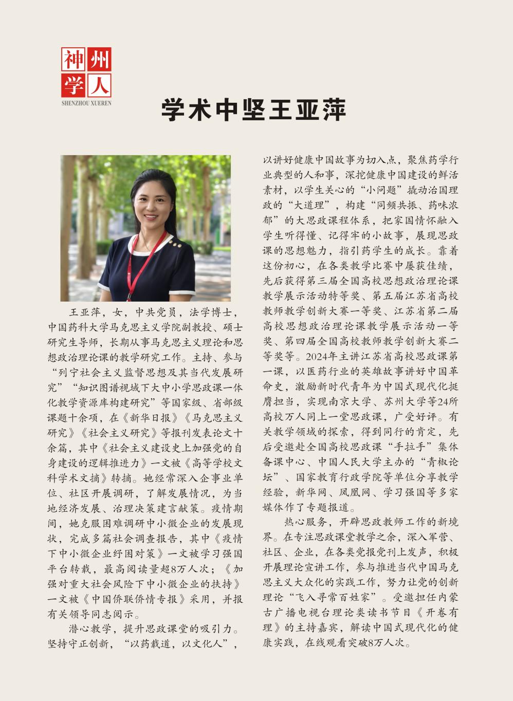 王亚萍,女,中共党员,法学博士,中国药科大学马克思主义学院副教授、硕士研究生导师,长期从事马克思主义理论和思想政治理论课的教学研究工作。主持、参与“列宁社会主义监督思想及其当代发展研究”“知识图谱视域下大中小学思政课一体化教学资源库构建研究”等国家级、省部级课题十余项,在《新华日报》《马克思主义研究》《社会主义研究》等报刊发表论文十余篇,其中《社会主义建设史上加强党的自身建设的逻辑推进力》一文被《高等学校文科学术文摘》转摘。她经常深入企事业单位、社区开展调研,了解发展情况,为当地经济发展、治理决策建言献策。疫情期间,她克服困难调研中小微企业的发展现状,完成多篇社会调查报告,其中《疫情下中小微企业纾困对策》一文被学习强国平台转载,最高阅读量超8万人次;《加强对重大社会风险下中小微企业的扶持》一文被《中国侨联侨情专报》采用,并报有关领导同志阅示。