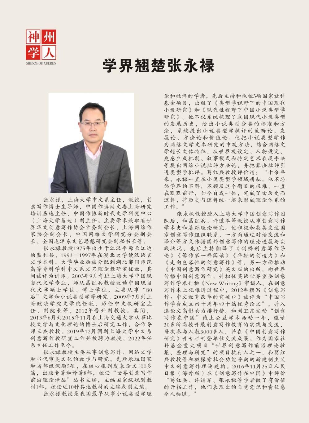 张永禄教授1975年出生于江汉平原长江边的监利县,1993—1997年在湖北大学读汉语言文学本科,大学毕业后被分配到湖北郧阳师范高等专科学科中文系文艺理论教研室任教,其间被评为讲师。2003年9月考进上海大学中国现当代文学专业,师从葛红兵教授攻读中国现当代文学硕士学位、博士学位,主要从事“80后”文学和小说类型学等研究。2009年7月到上海政法学院文学院任教,历任中文教研室主任、副院长等,2012年晋升副教授。其间,2013年6月到2015年11月在上海交通大学从事比较文学与文化理论的博士后研究工作,合作导师王杰教授。2019年12月调到上海大学中文系创意写作教研室工作并被聘为教授,2022年任系主任工作至今。