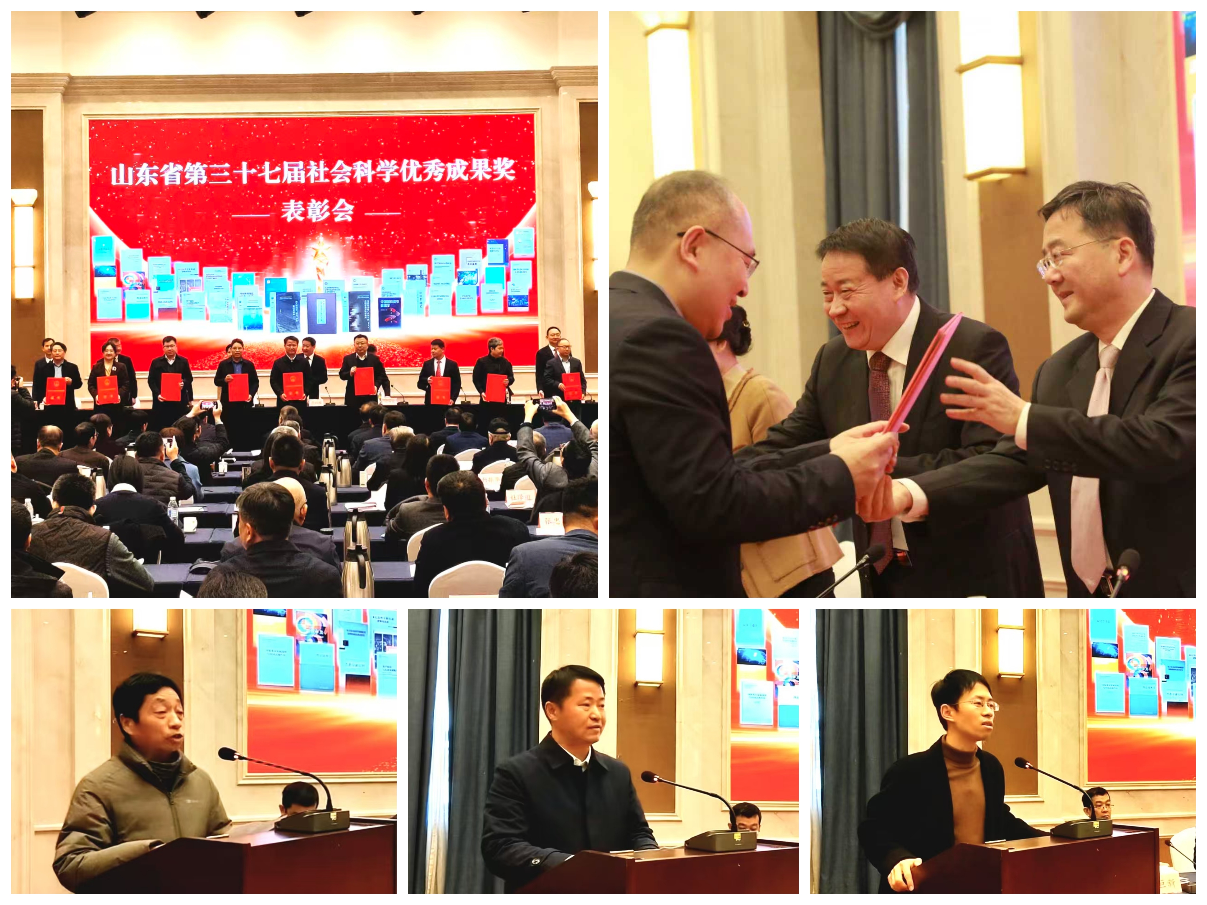 会议宣读了《山东省人民政府关于表彰山东省第三十七届社会科学优秀成果奖获奖成果和第十七届社会科学突出贡献奖、学科新秀奖获奖人员的通报》,向获奖人员代表颁发证书。曲阜师范大学、济南大学、山东师范大学获奖代表作交流发言。