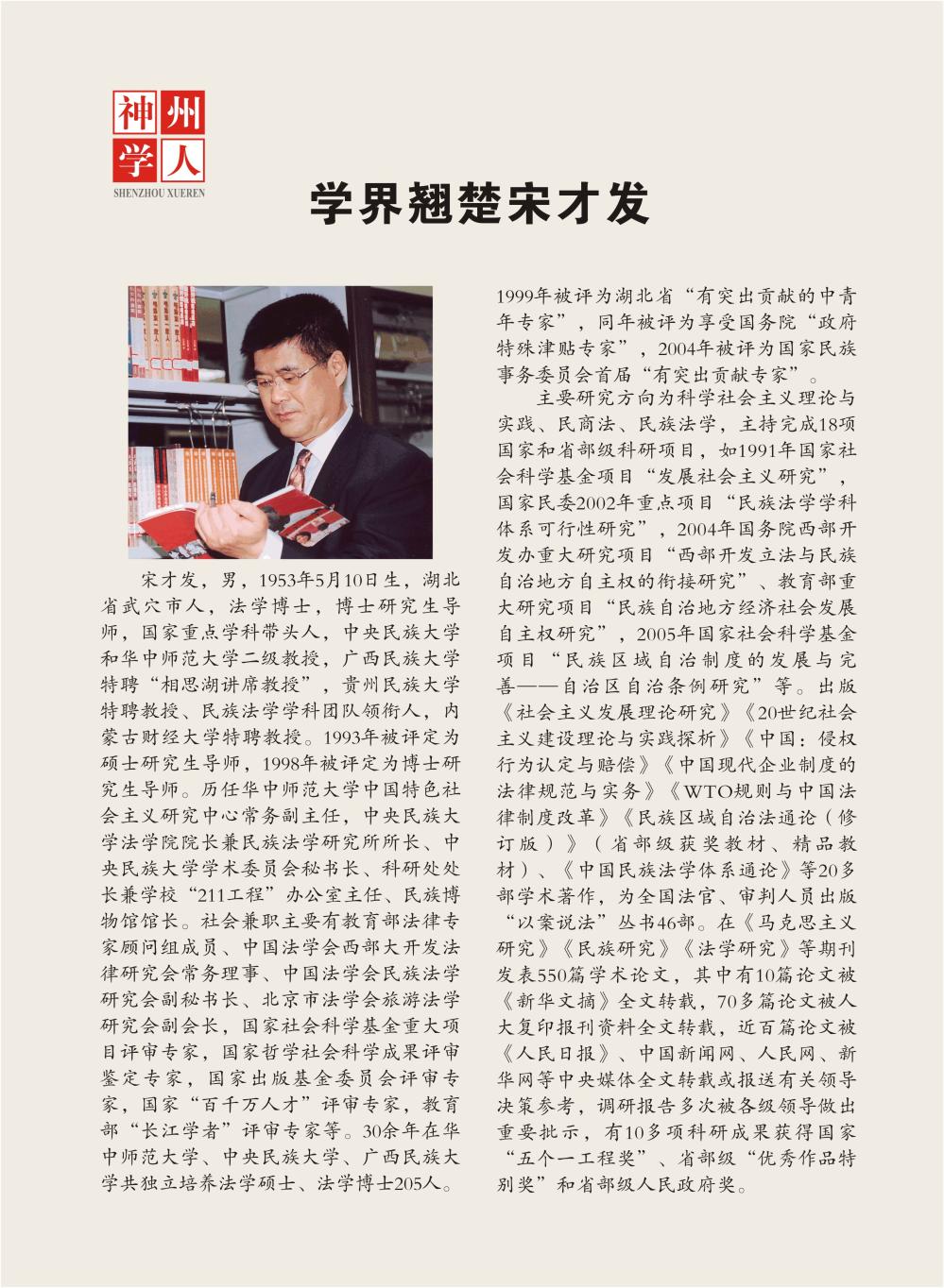 宋才发,男,1953年5月10日生,湖北省武穴市人,法学博士,博士研究生导师,国家重点学科带头人,中央民族大学和华中师范大学二级教授,广西民族大学特聘“相思湖讲席教授”,贵州民族大学特聘教授、民族法学学科团队领衔人,内蒙古财经大学特聘教授。1993年被评定为硕士研究生导师,1998年被评定为博士研究生导师。历任华中师范大学中国特色社会主义研究中心常务副主任,中央民族大学法学院院长兼民族法学研究所所长、中央民族大学学术委员会秘书长、科研处处长兼学校“211工程”办公室主任、民族博物馆馆长。社会兼职主要有教育部法律专家顾问组成员、中国法学会西部大开发法律研究会常务理事、中国法学会民族法学研究会副秘书长、北京市法学会旅游法学研究会副会长,国家社会科学基金重大项目评审专家,国家哲学社会科学成果评审鉴定专家,国家出版基金委员会评审专家,国家“百千万人才”评审专家,教育部“长江学者”评审专家等。30余年在华中师范大学、中央民族大学、广西民族大学共独立培养法学硕士、法学博士205人。1999年被评为湖北省“有突出贡献的中青年专家”,同年被评为享受国务院“政府特殊津贴专家”,2004年被评为国家民族事务委员会首届“有突出贡献专家”。